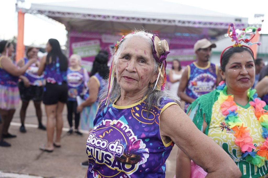 Entre os foliões, a experiência também desfilava com elegância. Maria das Graças Costa, de 73 anos, caminhava com tranquilidade, carregando no peito a faixa do projeto “Vem Dançar”, iniciativa da Prefeitura de Altamira que reúne pessoas para atividades de dança na Orla da cidade.